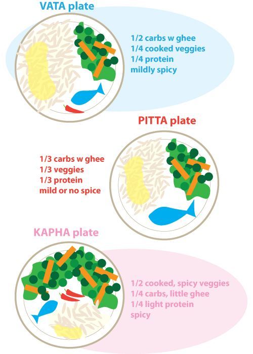 Хората с питта конституция трябва да избягват кисело, солено и лютиво, т.е. цитрусови плодове, туршии. Благоприятни за тях са сладки, горчиви и стипчиви храни, които трябва да не са топли и да са сготвени с умерено количество слънчогледово олио или претопено масло.